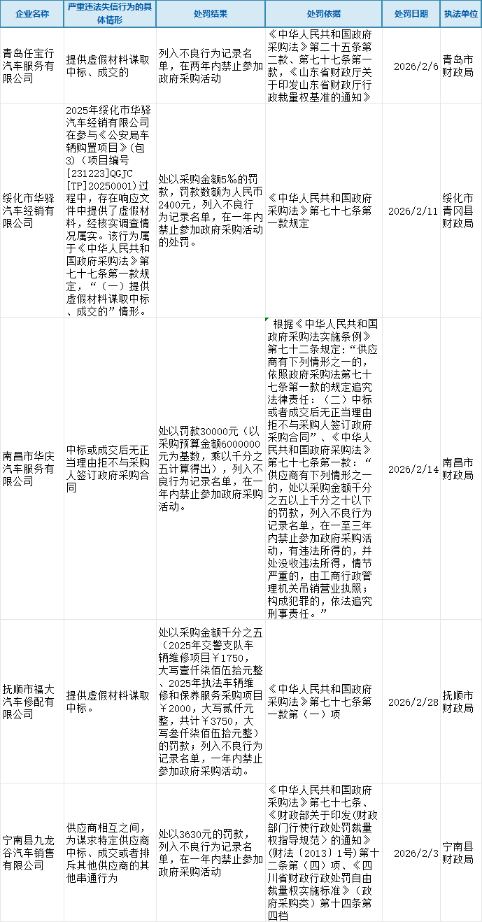 提供虚假材料:青岛任宝行汽车服务有限公司被列入不良行为记录名单,在两年内禁止参加政府采购活动。绥化市华驿汽车经销有限公司被处以采购金额5‰的罚款,罚款数额为人民币2400元,列入不良行为记录名单,在一年内禁止参加政府采购活动的处罚。抚顺市福大汽车修配有限公司被处以采购金额千分之五(2025年交警支队车辆维修项目¥1750,大写壹仟柒佰伍拾元整、2025年执法车辆维修和保养服务采购项目¥2000,大写贰仟元整,共计¥3750,大写叁仟柒佰伍拾元整)的罚款;列入不良行为记录名单,一年内禁止参加政府采购活动。